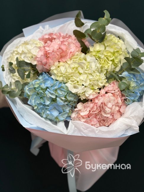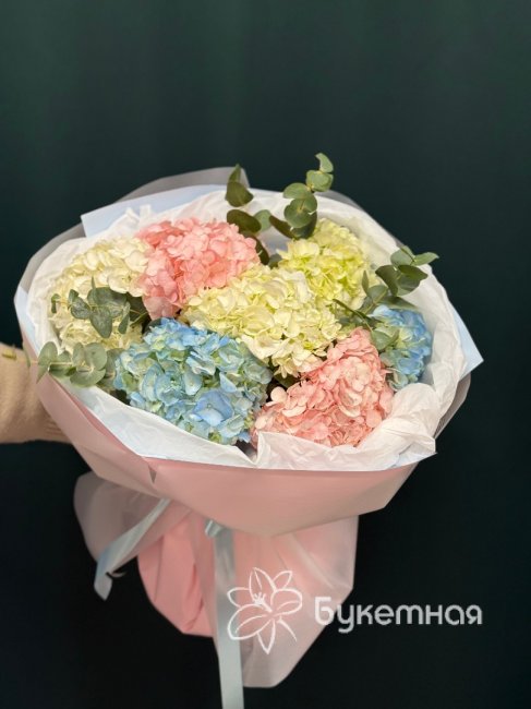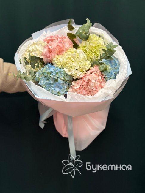 Описание Букет в нежно-голубых тонах с розовой и белой гортензией, создаёт атмосферу нежности и романтики.