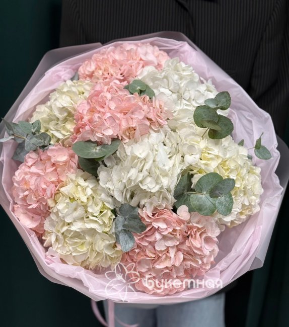 Описание Букет моно 9 гортензий в нежно- розовых и белых тонах, создаёт атмосферу нежности и романтики.