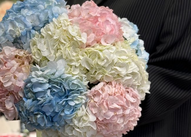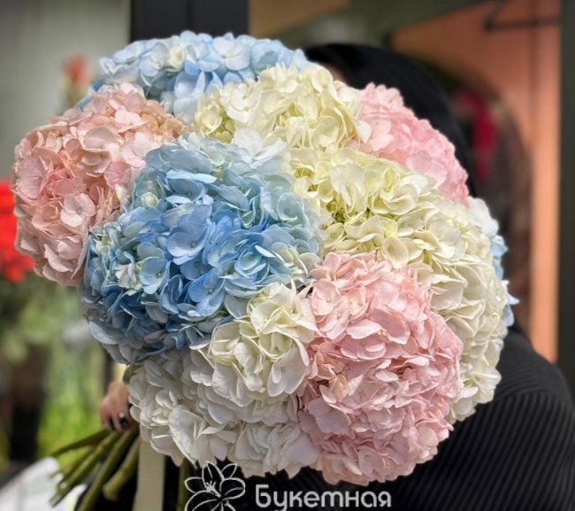Описание Букет из 9 шт разноцветных шапок гортензий, порадует своей красотой и изысканностью !