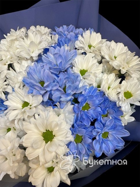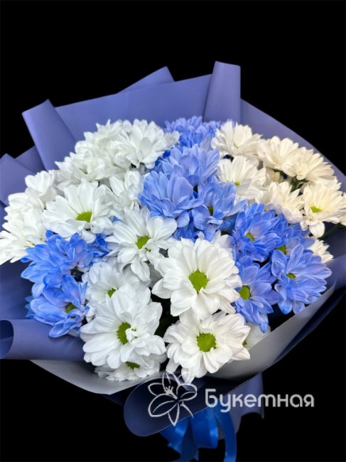 Описание Трогательный букет из белых и голубых хризантем 9 шт воплощение нежности и любви к жизни.