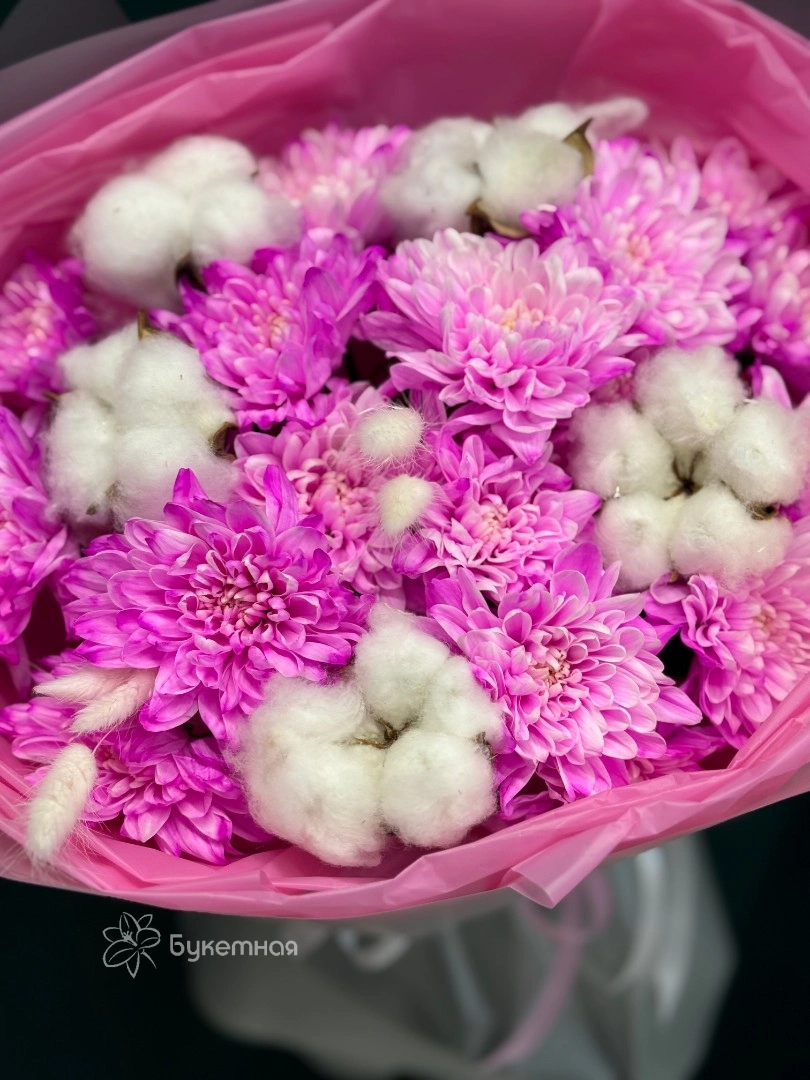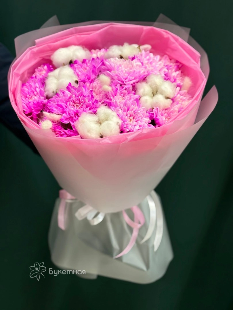 Трогательный букет из белых хризантем — воплощение нежности и любви к жизни. Она выглядит очень свежо, нежно и празднично. Цвет оформления может отличаться, менеджер обязательно согласует цветовую гамму с заказчиком исходя из наличия и повода!