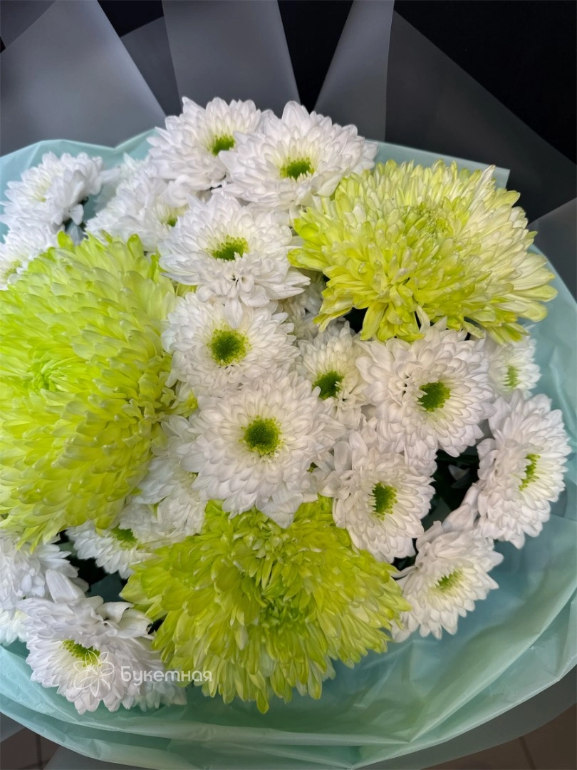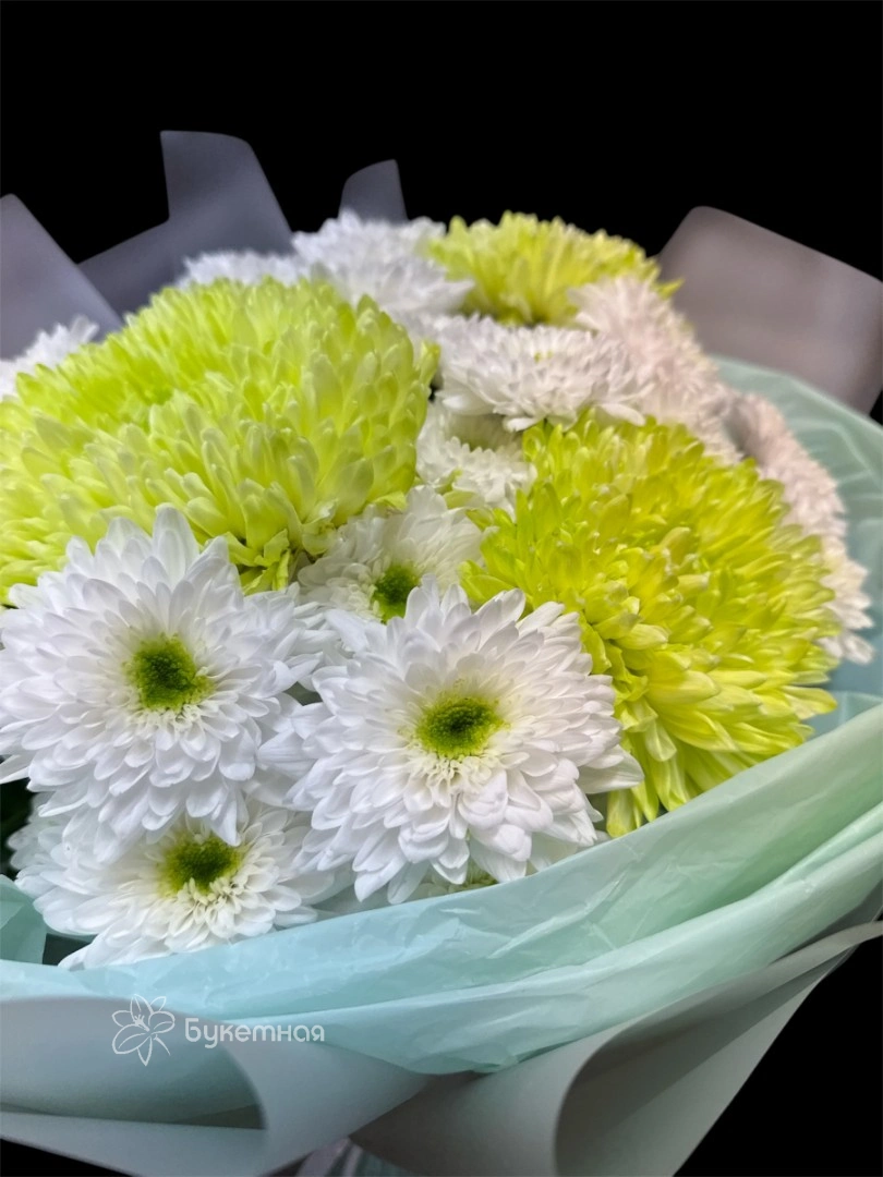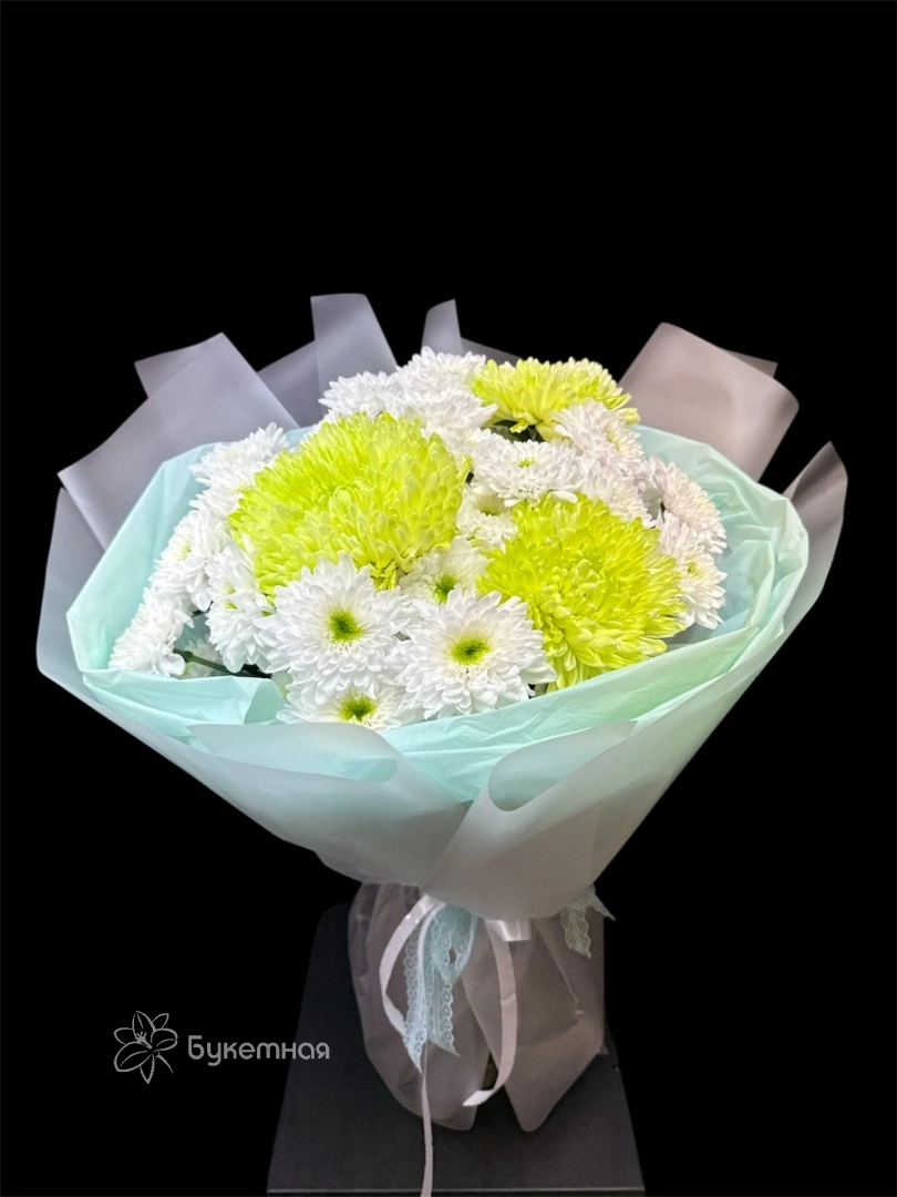 Праздничный букет хризантем! Цвет оформления и цветов может отличаться, менеджер обязательно согласует цветовую гамму с заказчиком исходя из наличия и повода!