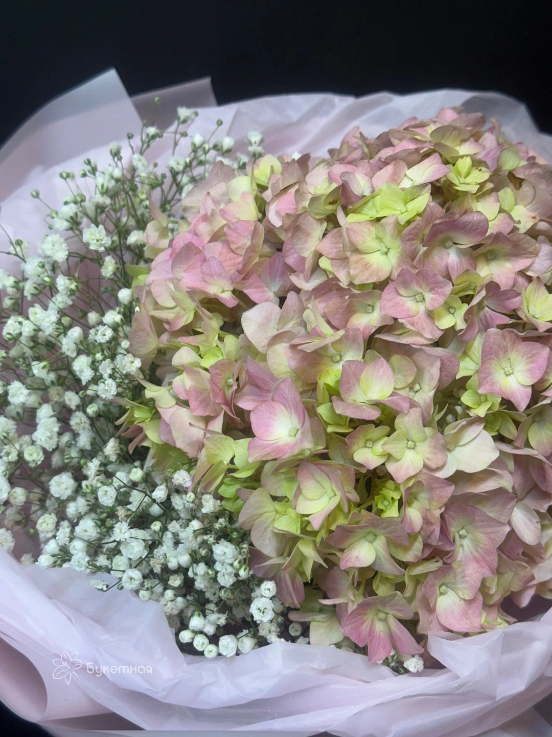 Нежно розовая гортензия, белая гипсофила, букет в воздушной упаковке