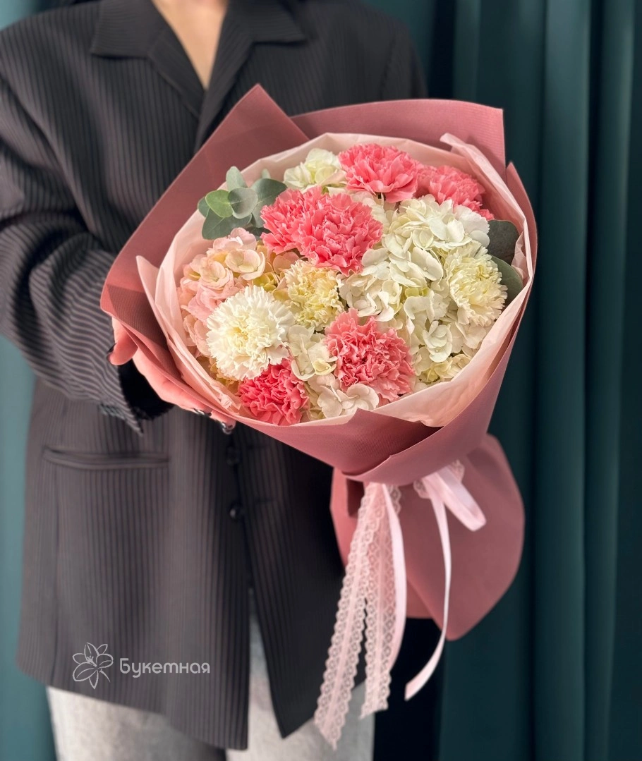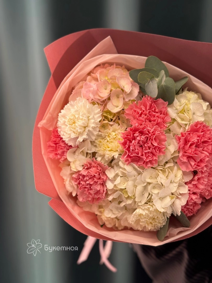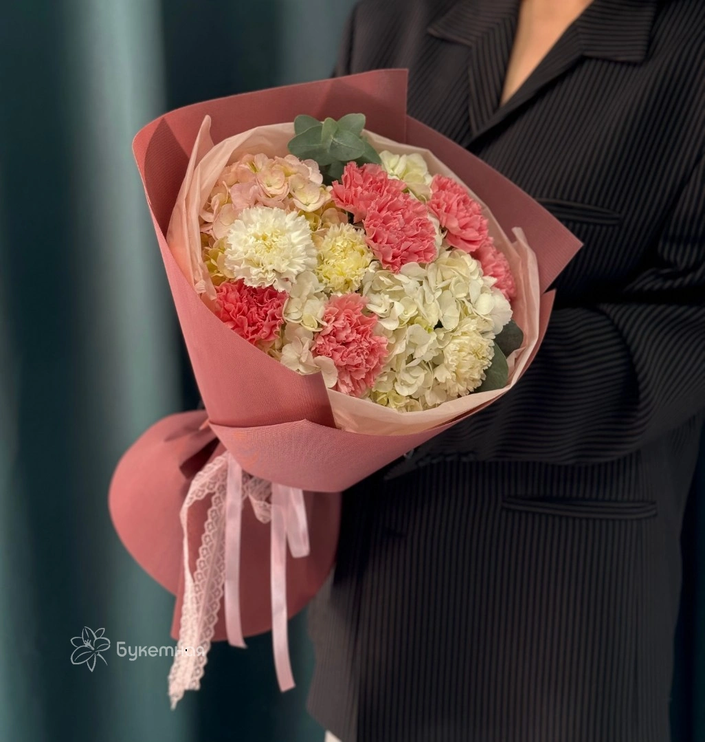 Порадуйте любимую ярким розовым букетом с гортензией и диантус на день рождения или юбилей.