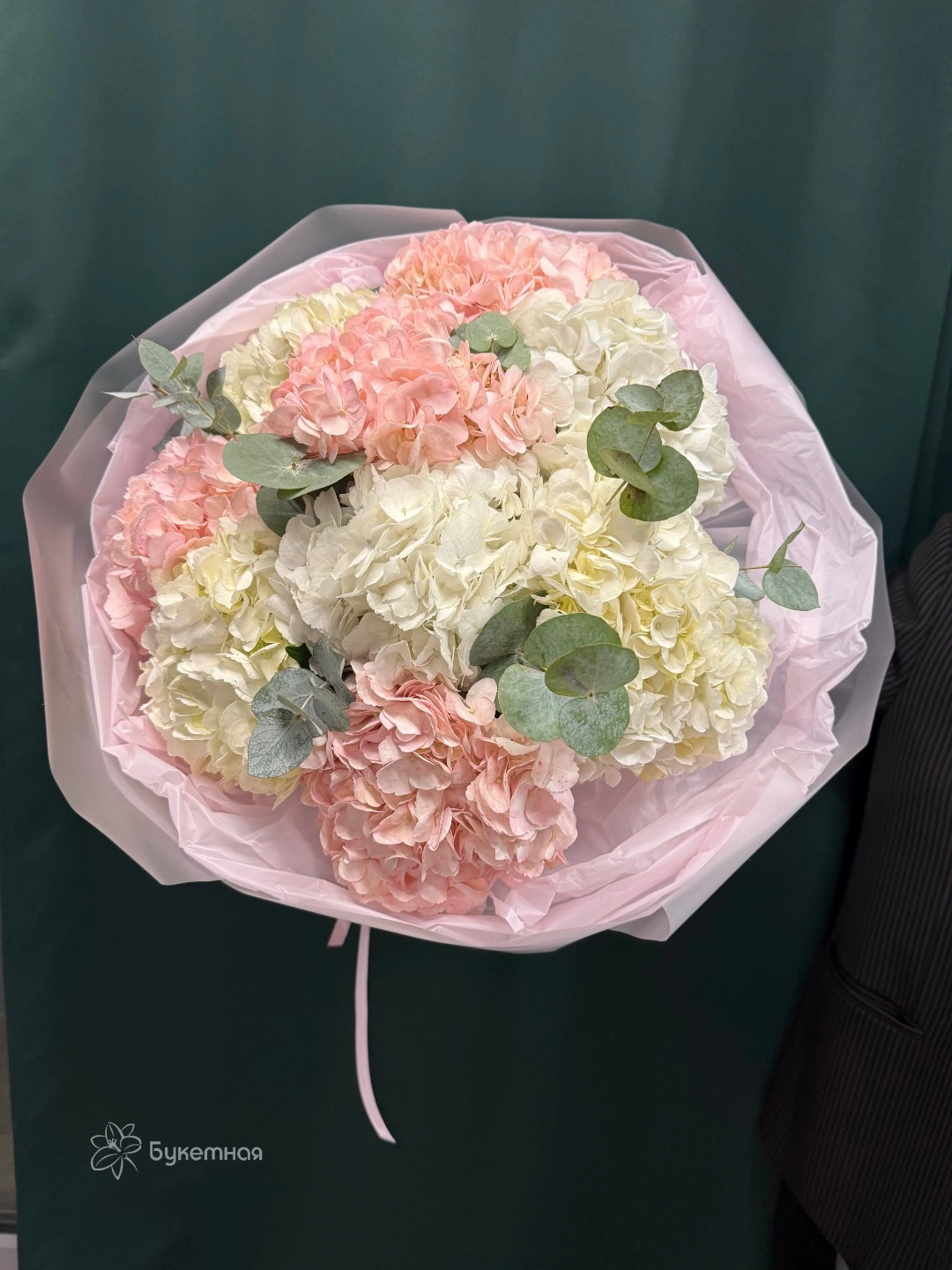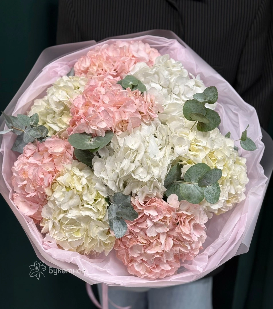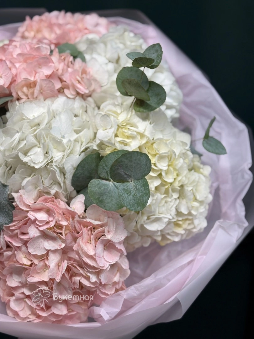 Букет моно 9 гортензий в нежно- розовых и белых тонах, создаёт атмосферу нежности и романтики.