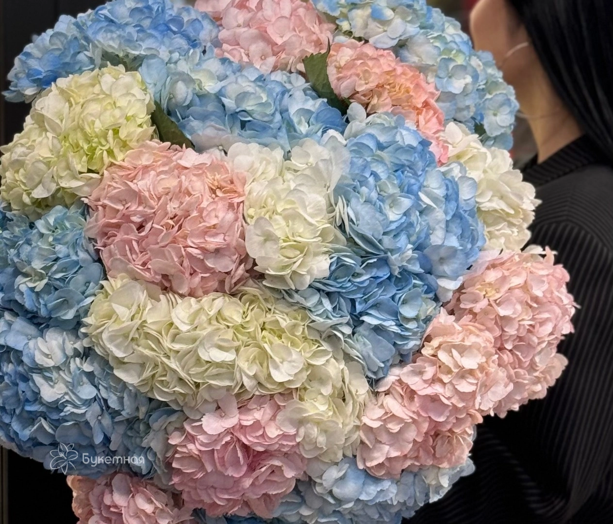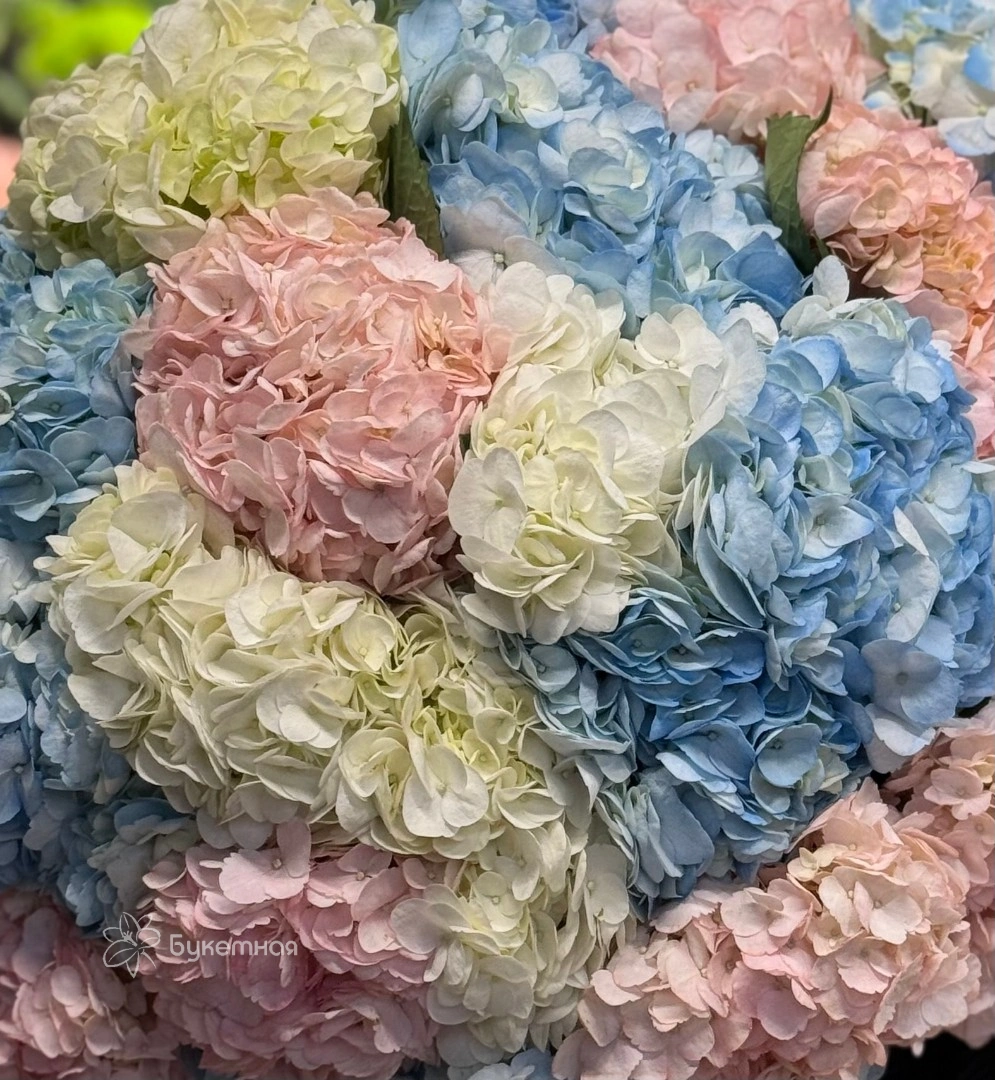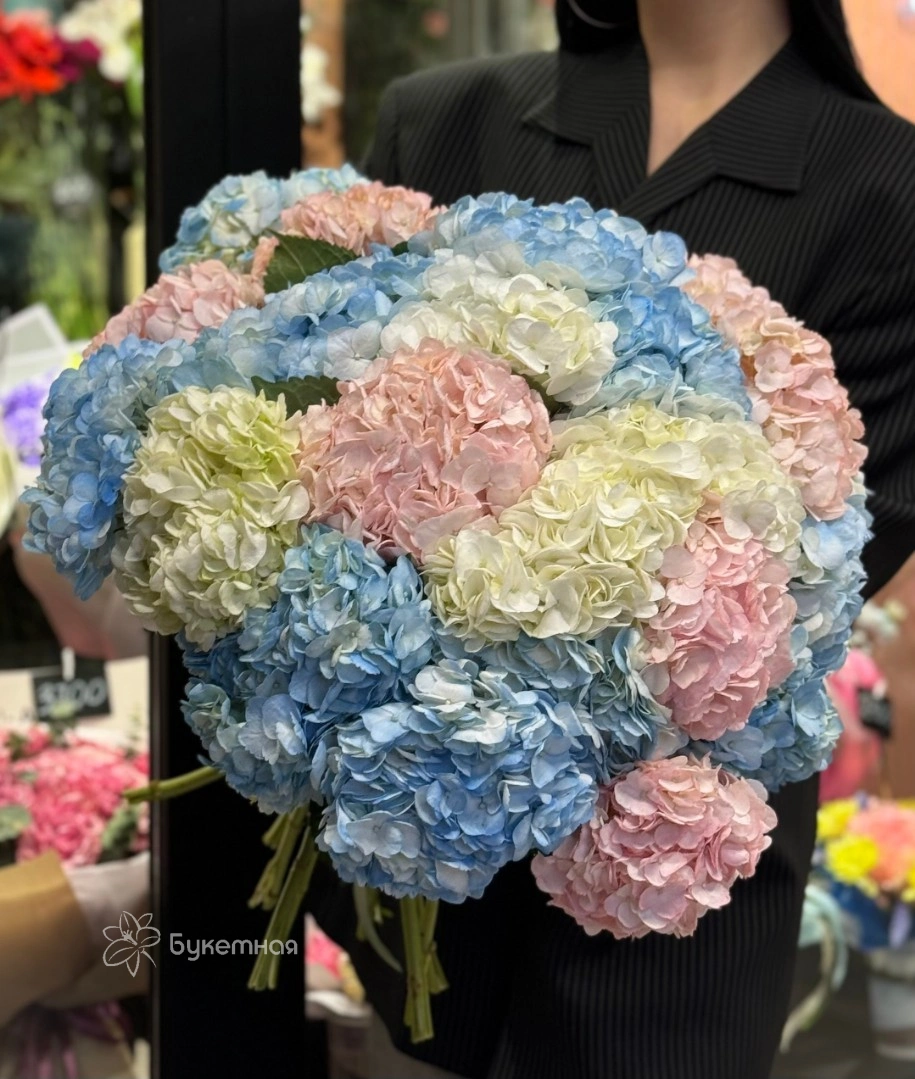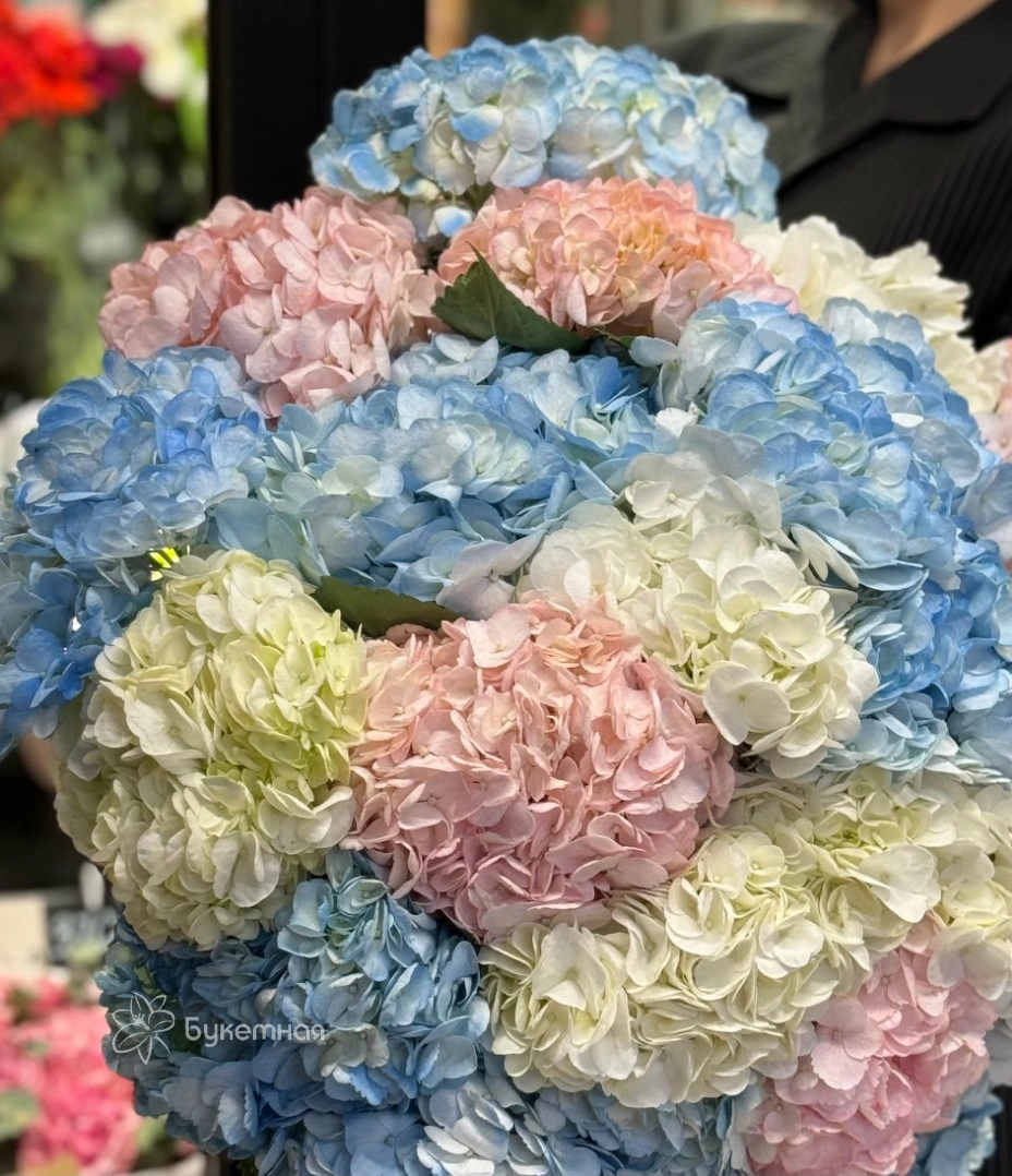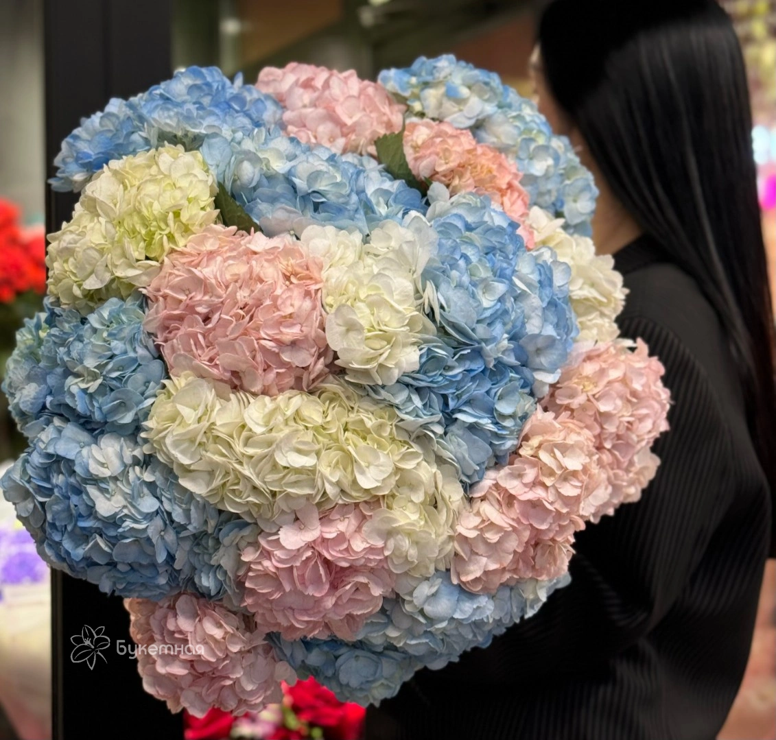 Прекрасное сочетание 15 гортензий цветов и оттенков делают этот букет желанным подарком, который приятно получить на праздник или просто так, без повода.