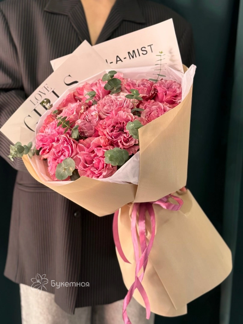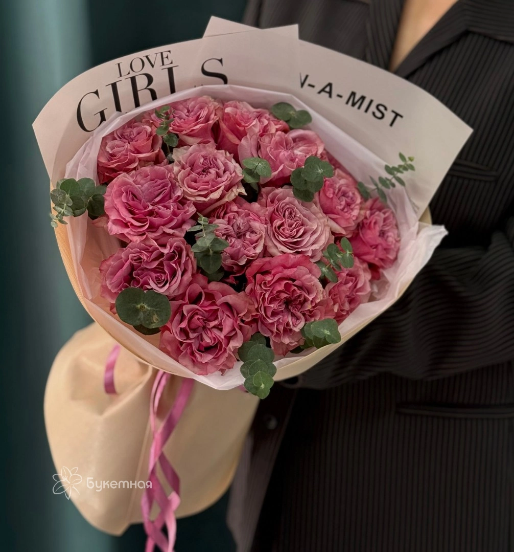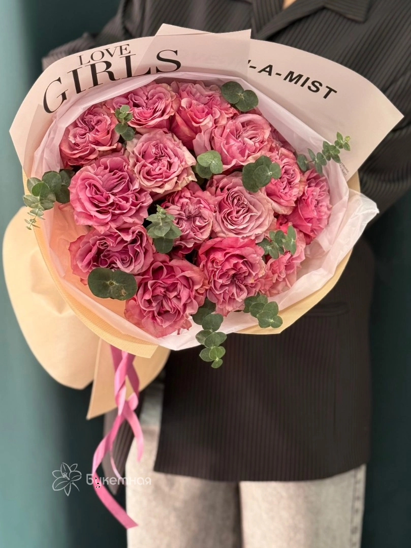 Нежный букет из крупных пионовидных 15 шт роз сорта Кантри Блюз с веточками эвкалипта в стильной упаковке