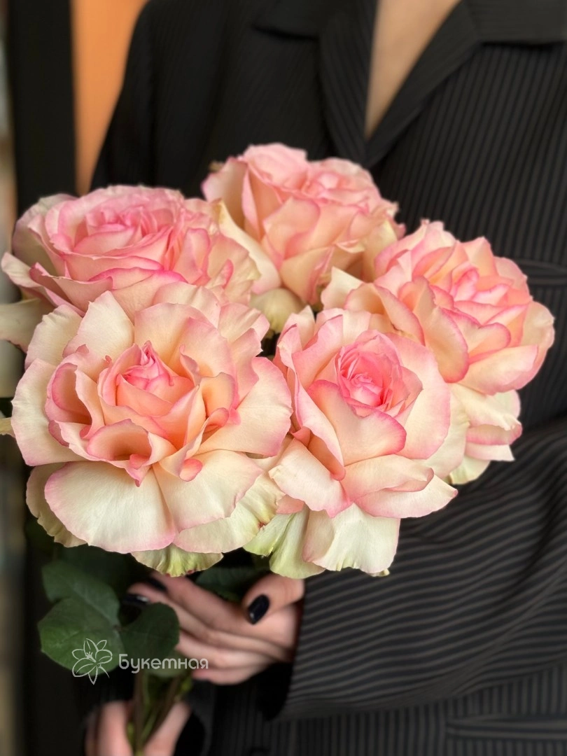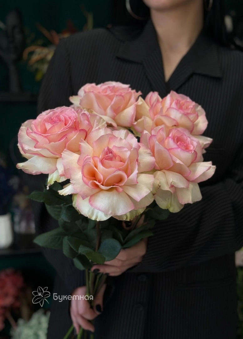 Каждая роза раскрывается в пышный бутон с переливами розового оттенка, создавая атмосферу нежности и изысканности.