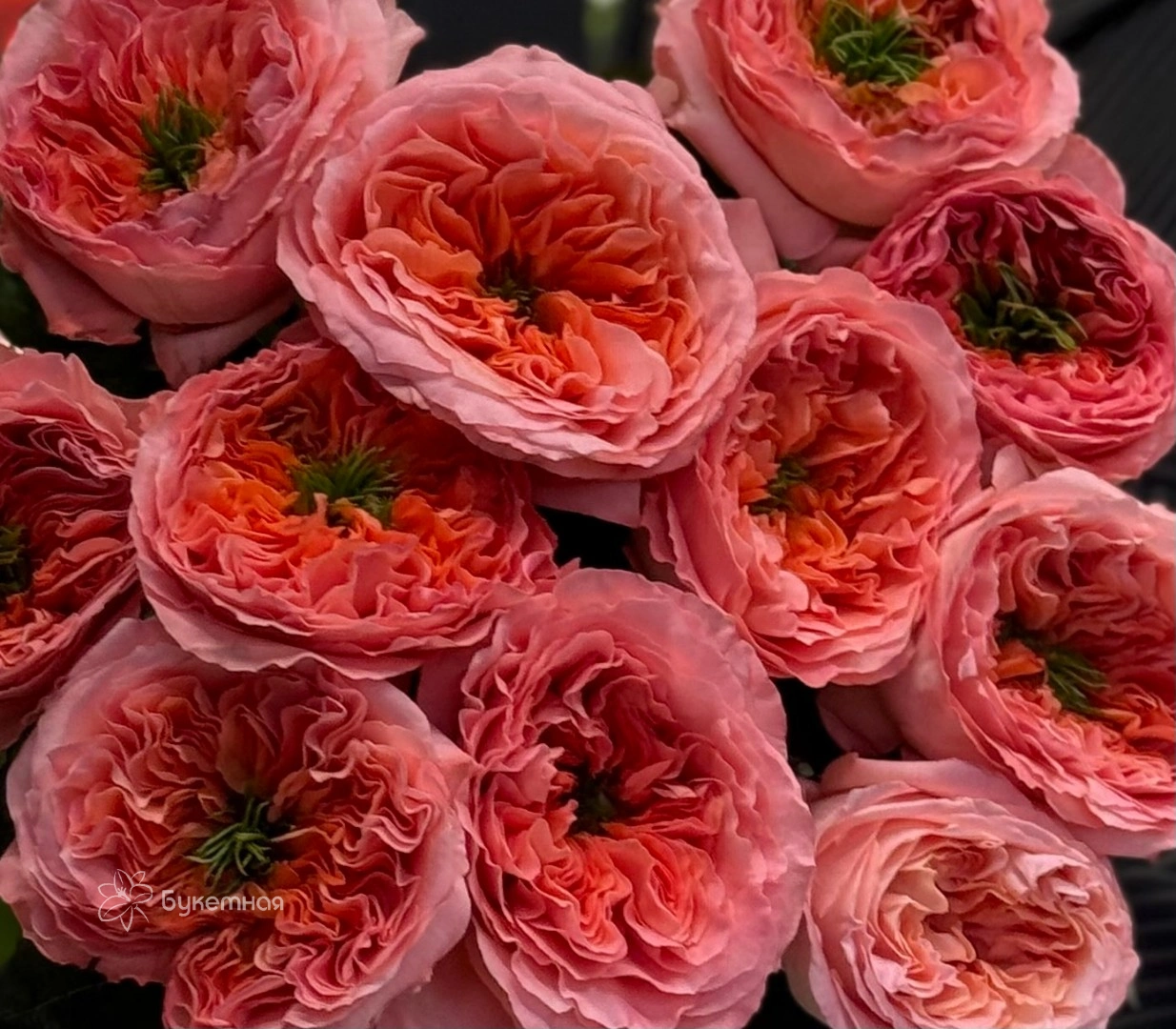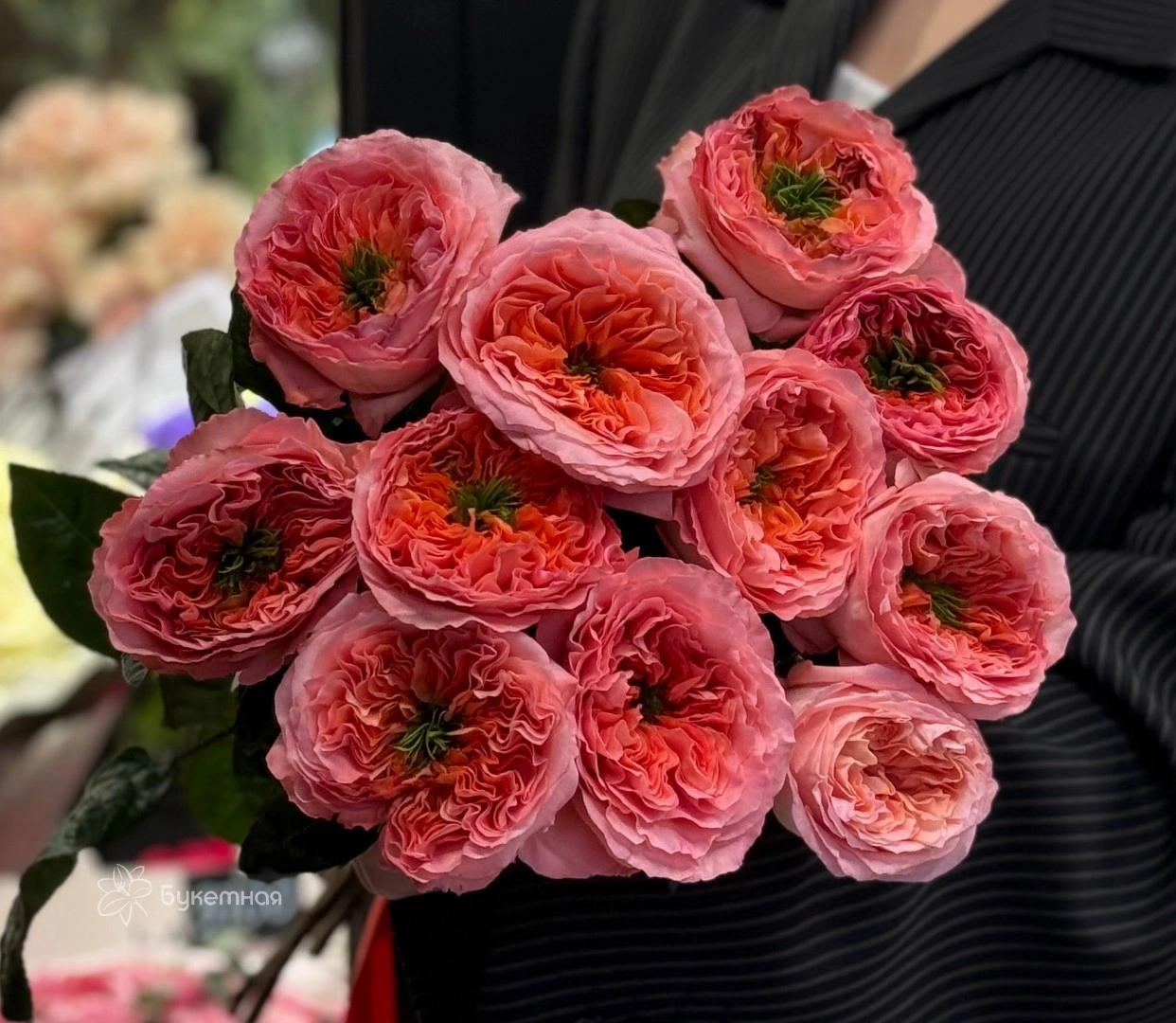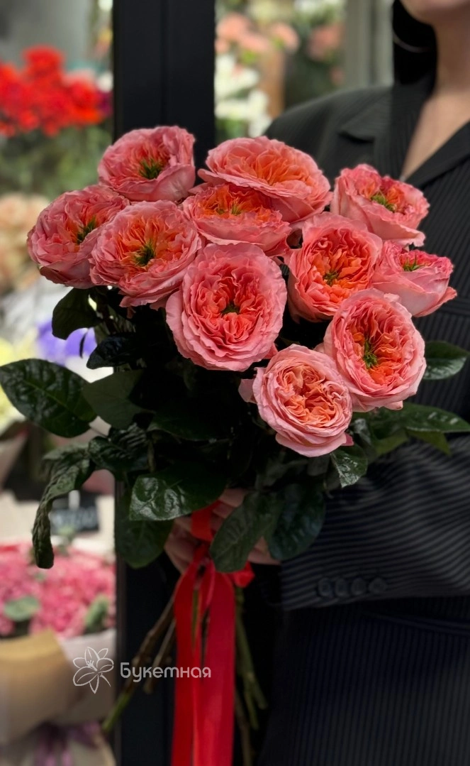 Благородство и изящество пионовидной розы Мандарин сделает любой букет изысканным подарком по любому поводу. Яркая зелень идеально гармонирует с насыщенным персиково-розовым оттенком цветов.