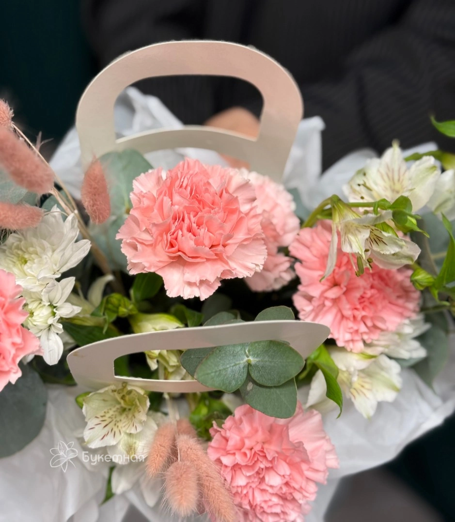 Пышные диантусы, изящные альстромерии, романтичные хризантемы и свежий эвкалипт создают гармоничный и воздушный букет.