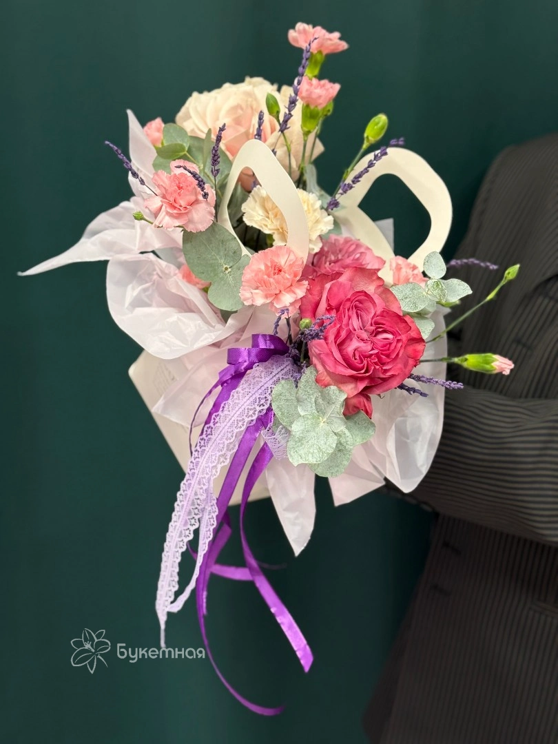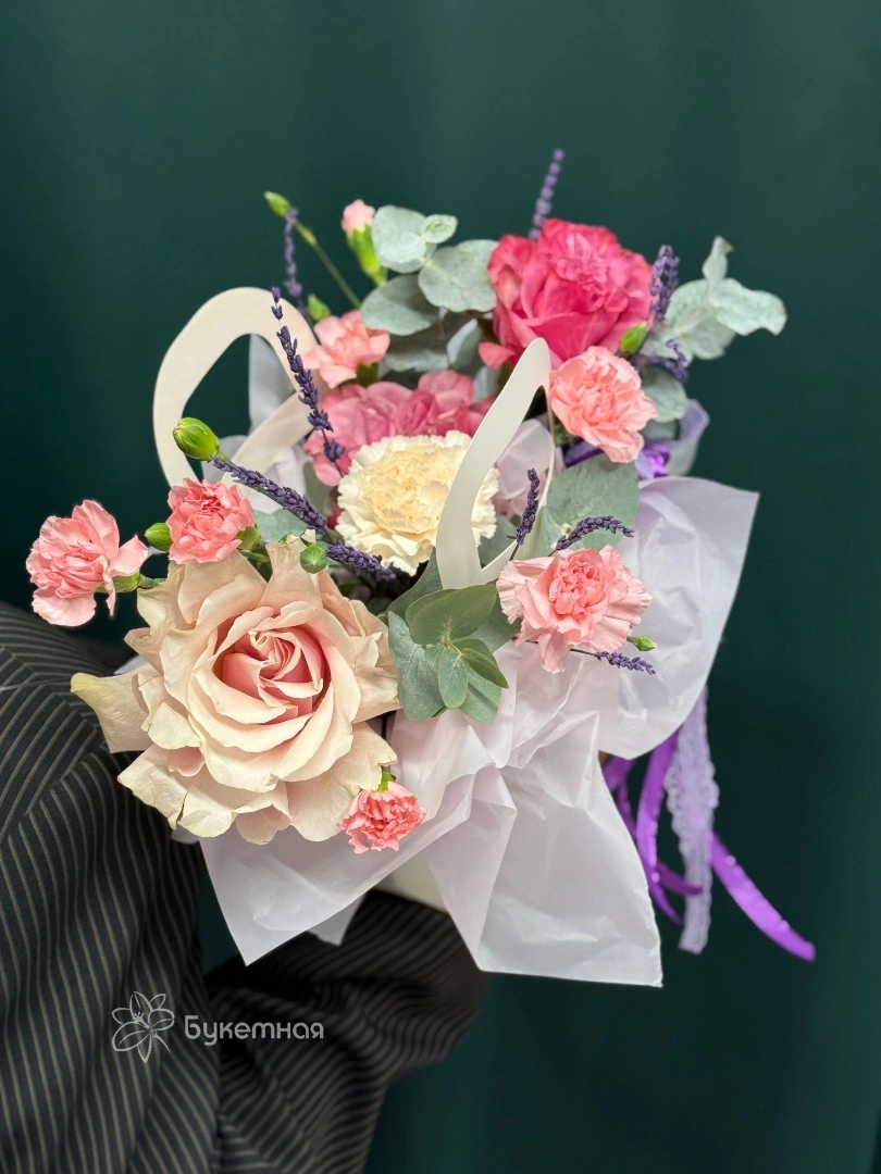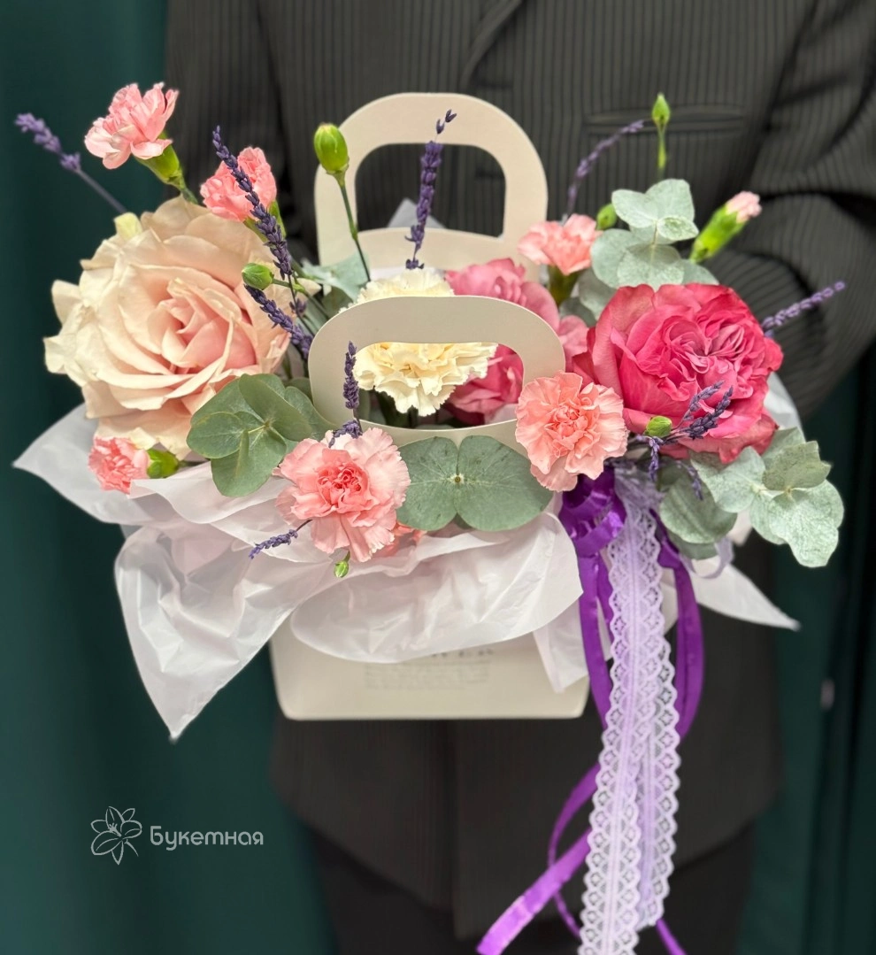 ГлавнаяКаталогКомпозицииВ сумочкеЦветочная сумочка «Прованс»