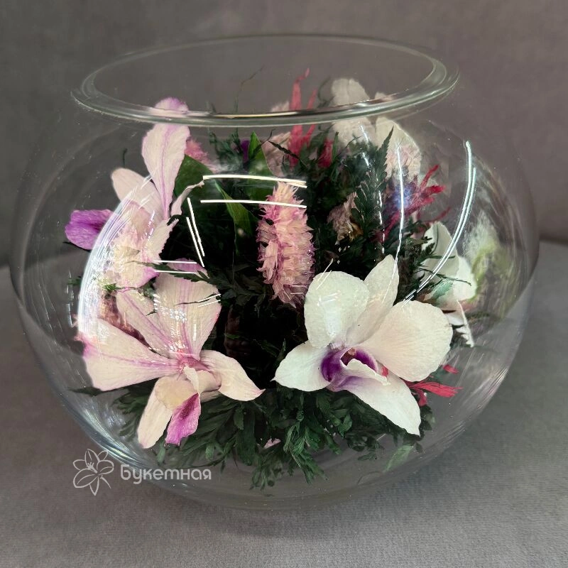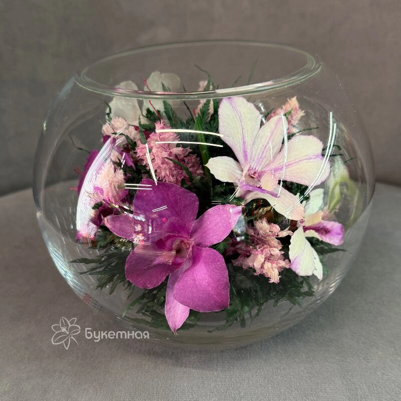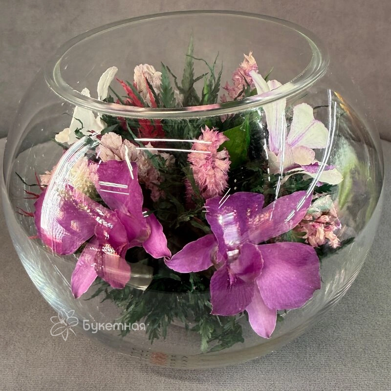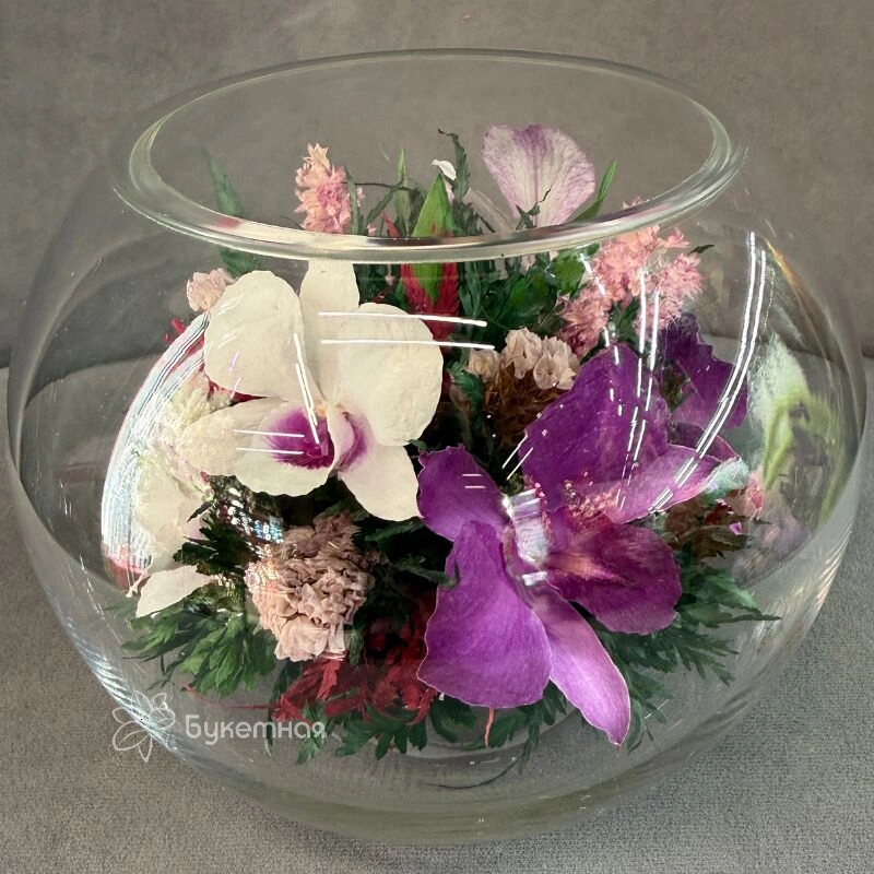 композиция в вакууме Радость изысканно сочетает в себе элегантность и свежесть, создавая атмосферу радости и тепла. Центральным элементом композиции является изящная орхидея, подчёркивающая утонченность и красоту. Цветы расположены гармонично, подчёркивая уникальность каждого экземпляра. Такой букет станет прекрасным подарком в интерьере для тех, кто ценит изысканный вкус и нежность. Подарите композицию «Радость» и она будет радовать более «5 лет!
