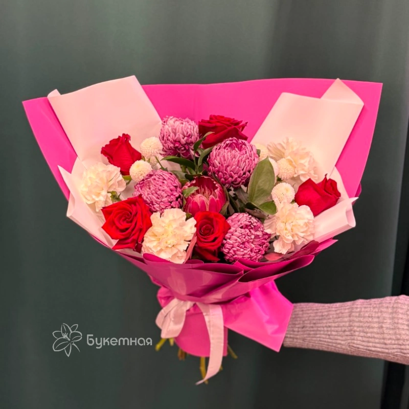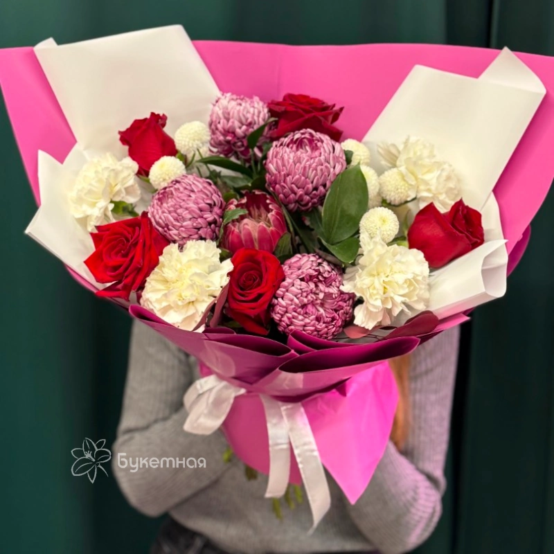 Этот букет – настоящее произведение искусства! Сочные красные розы, словно объятые загадочным фиолетовым сиянием сортовой хризантемой.
