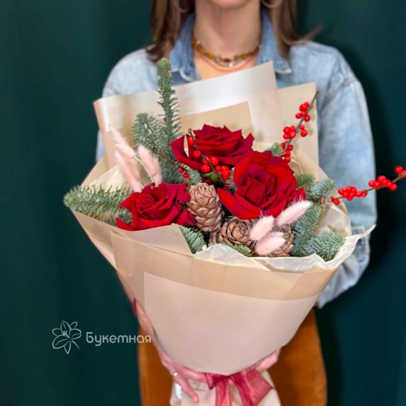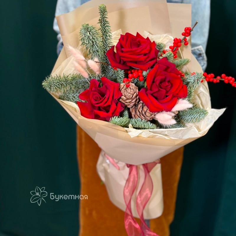 В основу букета составляют пышные французские розы ярко-бордового оттенка, символизирующие страсть и тепло даже в холодное время года. Их насыщенный цвет напоминает огонь и создаёт уютную атмосферу праздника.
