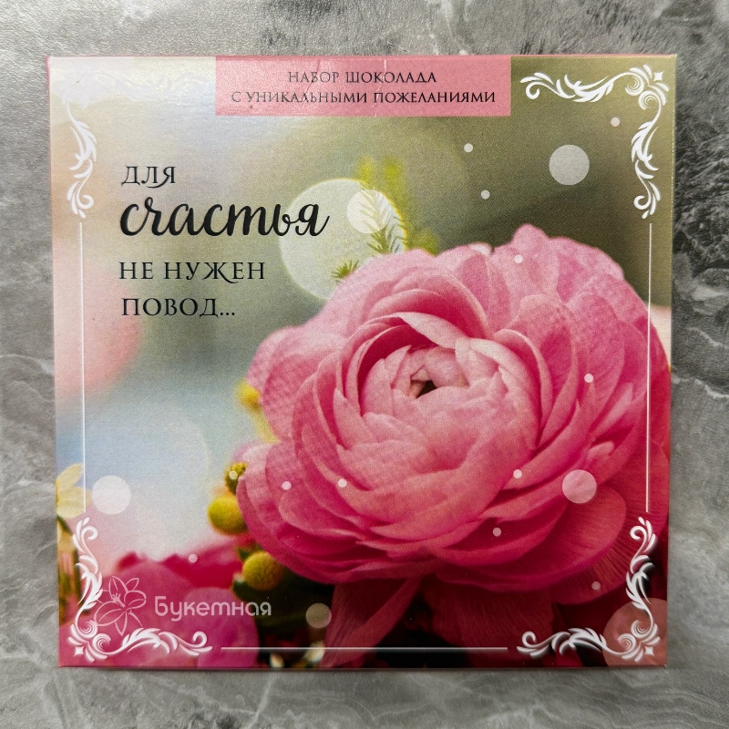 Погрузитесь в мир сладкого удовольствия с фирменным шоколадом «Для счастья не нужен повод». Этот изысканный вкус подарит радость и тепло в любой момент. Роскошный дизайн и качественный состав цветов делают его идеальным подарком для близких и друзей. Позвольте себе каплю счастья каждый день!
