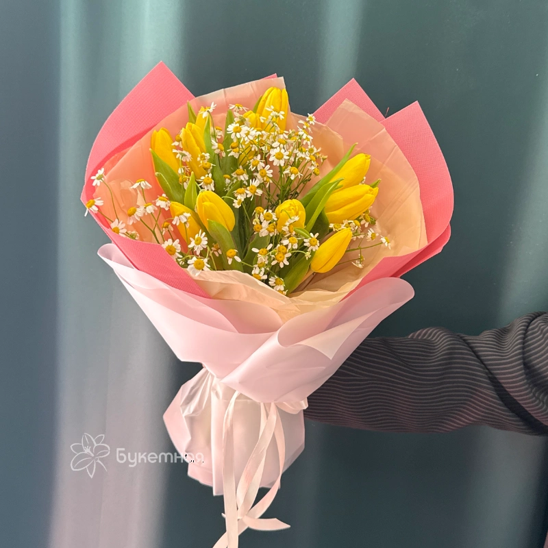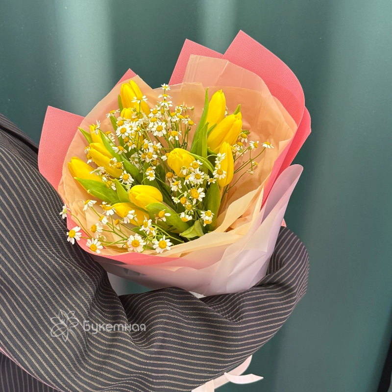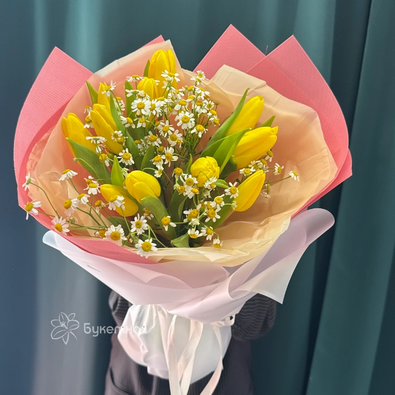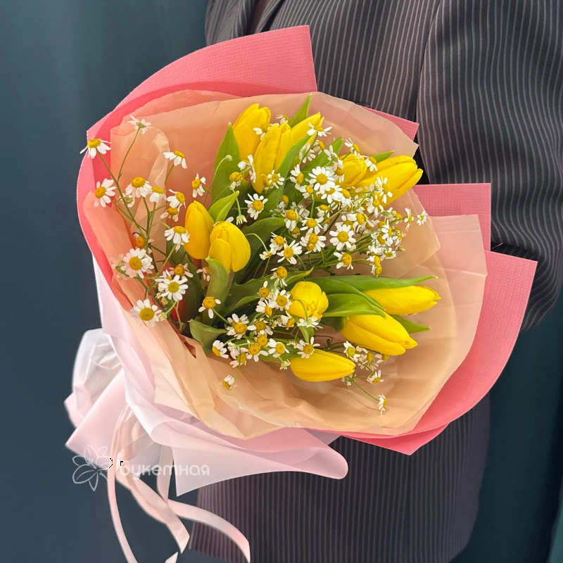 Букет «Жанна» — это изящное сочетание ярких тюльпанов и нежных матрикарий, создающих гармонию и элегантность. Цветы подобраны так, чтобы подчеркнуть изящность и утонченность композиции. Тюльпаны в букете добавляют яркости и солнечного настроения, а матрикарии придают воздушность и изысканность. Этот букет идеально подойдет для поздравления и подарка на любой случай. Он подходит для создания теплой и радостной атмосферы. Букет «Жанна» подчеркнет вашу искреннюю заботу и внимание к близким людям.