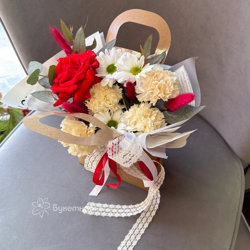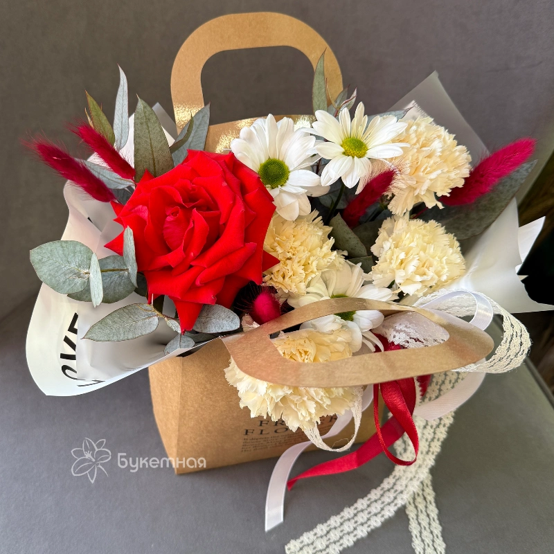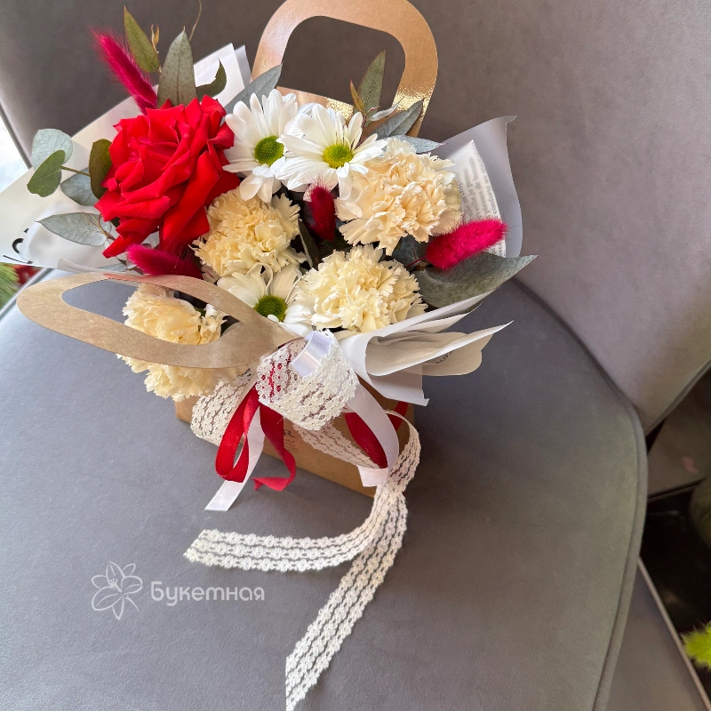 Букет-композиция в сумочке «Луиза» — это изысканное и оригинальное украшение для любого интерьера или подарка. В его составе использованы лагурус сухоцветы, придающие композиции особую стойкость и естественный вид. Эвкалипт добавляет свежести и ароматной ноты, создавая приятную атмосферу. Гвоздика и хризантема кустовая отлично подчеркивают цветовую гамму и добавляют объем. Роза в букете придает ему яркости и романтичности, делая композицию более изящной. Элегантная сумочка делает этот букет удобным для подарка и ярким аксессуаром. Оригинальный дизайн и гармоничное сочетание цветов делают композицию универсальным подарком для любого повода. «Луиза» — это стильное решение для тех, кто ценит красоту и уникальность в каждом деталюшку.