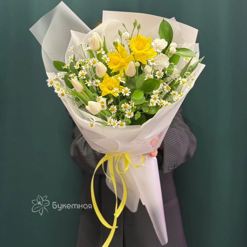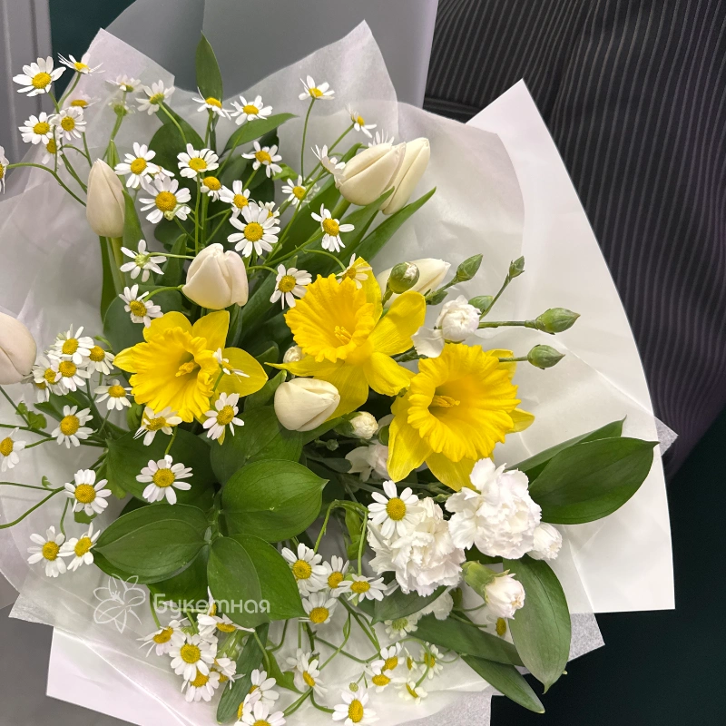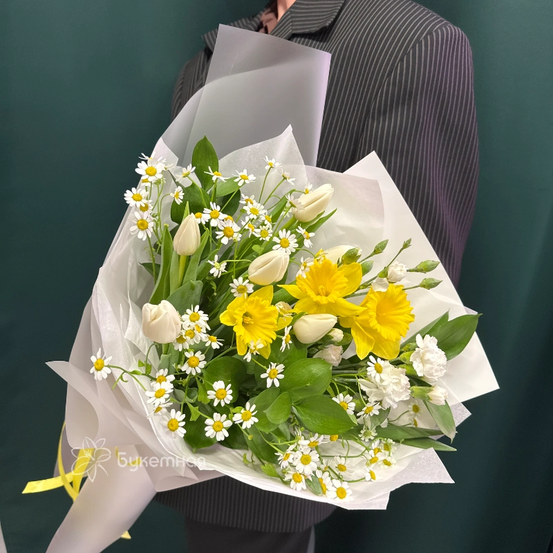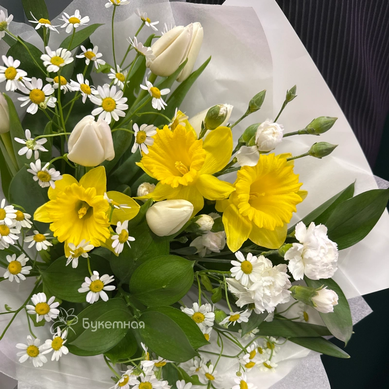 Букет «Лучик» — это яркое и солнечное украшение любого пространства. В его составе преобладают свежие нарциссы и тюльпаны, символизирующие пробуждение и новые начинания. Акценты из гвоздик добавляют композиции нотки романтичности и утонченности. Матрикария придает букету легкую воздушность и объемность, а Рускус добавляет зелени и насыщенности зеленью. Цветовая гамма бутона – это теплые желтые и нежные розовые оттенки, создающие атмосферу тепла и радости. Букет отлично подойдет для поздравлений и радостных событий. Он радует глаз и поднимает настроение своим ярким и свежим видом. «Лучик» отлично смотрится как в комплекте с подарком, так и сам по себе. Это гармоничное сочетание цветов, которое символизирует солнечное настроение и светлую энергию. Такой букет непременно порадует своим видом и создаст атмосферу праздника.