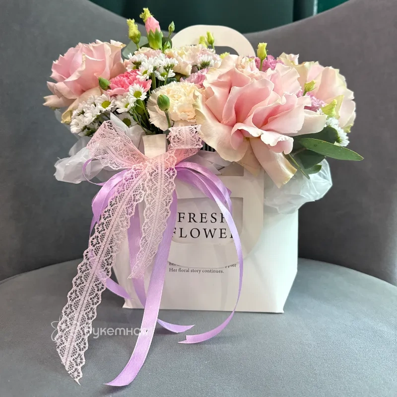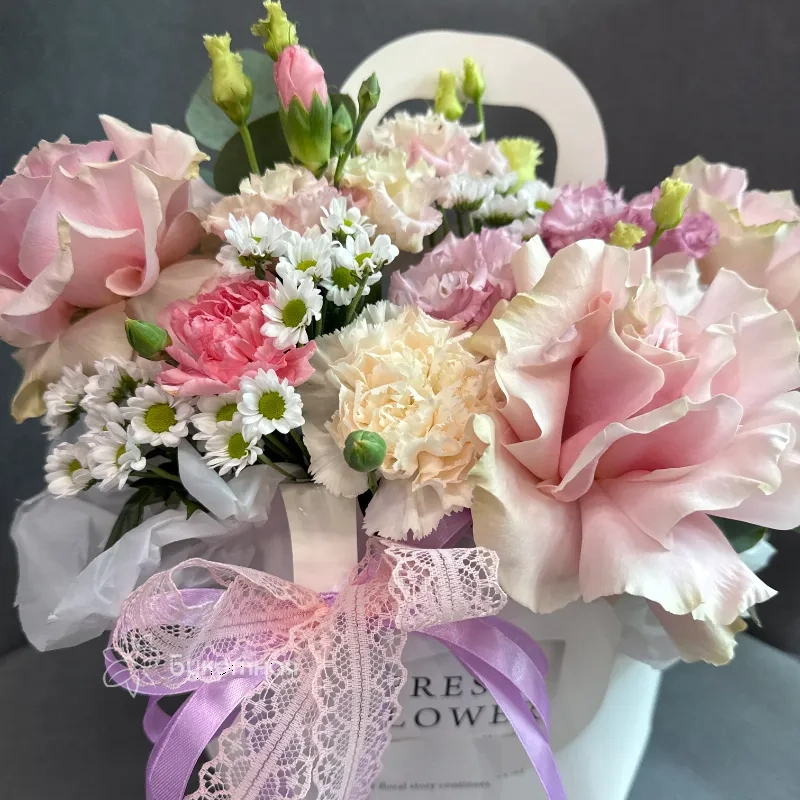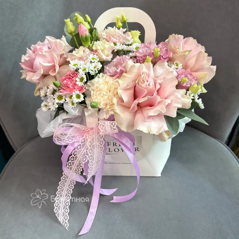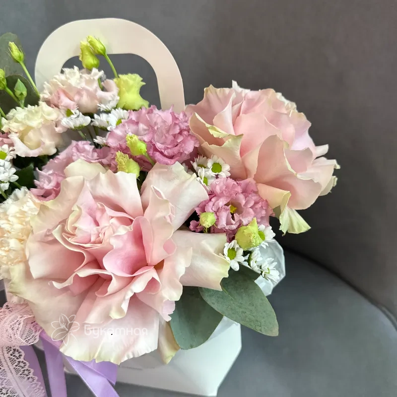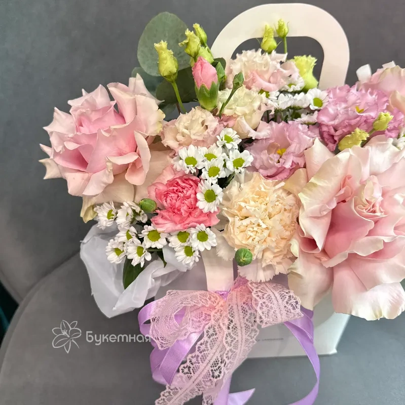 Букет-композиция «Элли» — это изысканный букет, созданный для тех, кто ценит красоту и гармонию. В его составе сочетаются нежные оттенки Эвкалипта, нежные Гвоздики и изящные сантини создающие ощущение свежести и уюта. Эустома добавляет воздушности и легкости, а Роза — символ любви и романтики, придавая композиции особый шарм. Благодаря насыщенной палитре и гармоничному сочетанию цветов, букет идеально подойдет для любого праздника или неожиданного сюрприза. Композиция «Элли» передает тепло и заботу, поднимая настроение и создавая атмосферу праздника. Этот букет станет деликатным подарком для близких и друзей, подчеркнет ваше внимание и чувство стиля. Закажите «Элли» и подарите моменты радости и красоты!