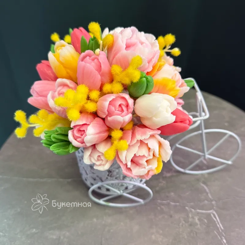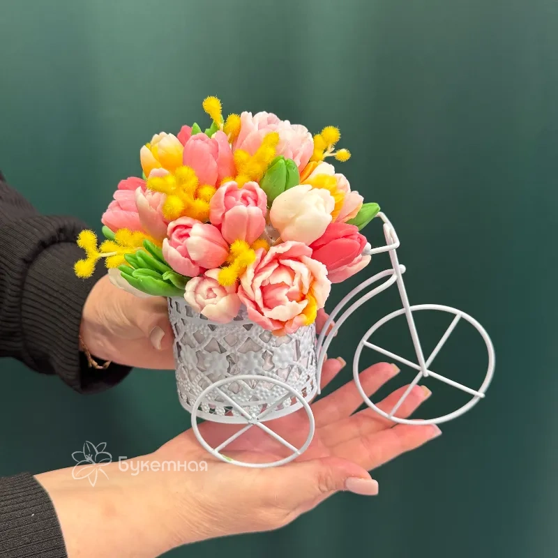 Этот изысканный букет «Велосипед» станет ярким акцентом в любом интерьере или отличным подарком для близкого человека. В его составе нежные мыльные цветы, которые долго сохраняют свою красоту и свежесть. Благодаря оригинальной компоновке, букет привлекает внимание своей уникальностью и стилем. Он идеально подойдет для праздника, особого события или для создания уютной атмосферы дома. Такой подарок подчеркнет ваше внимание и заботу. Закажите букет «Велосипед» и подарите радость и тепло своим близким.