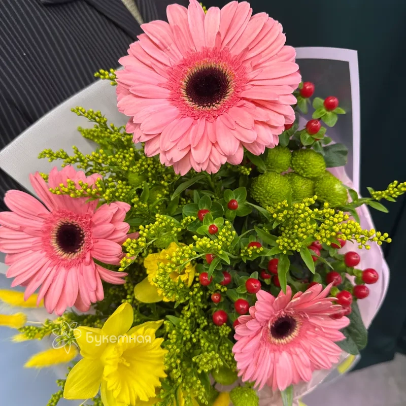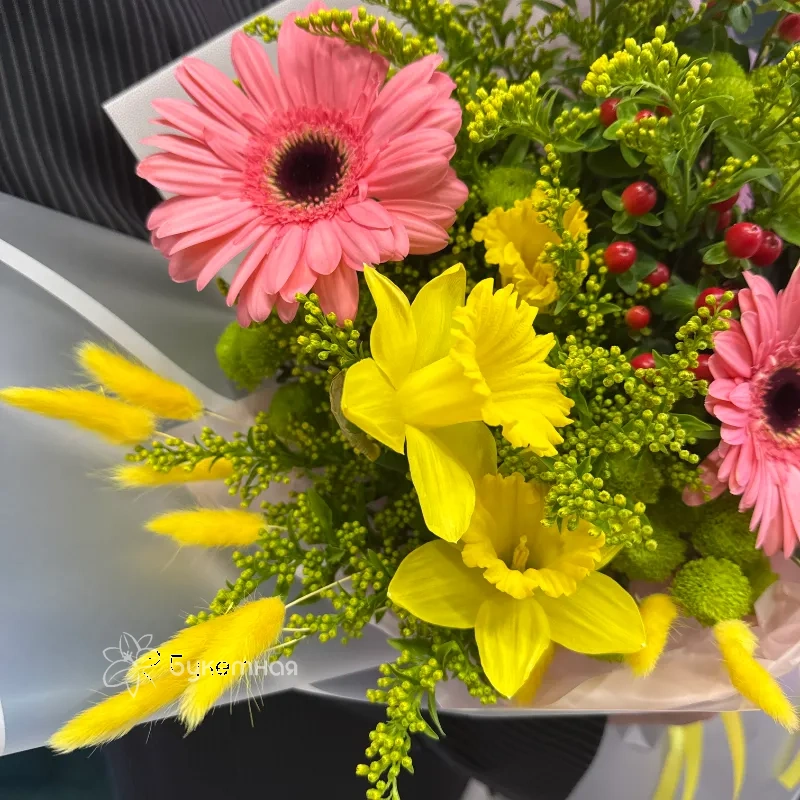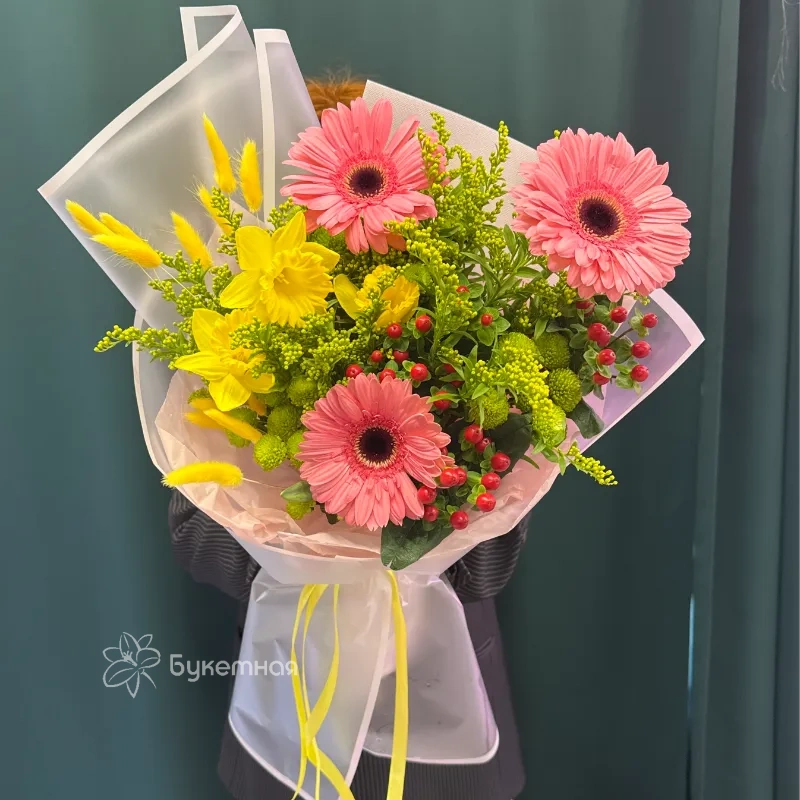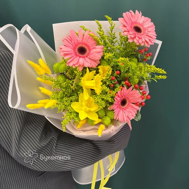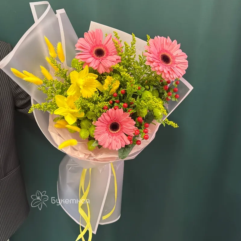 Букет «Весеннее настроение» — это яркое сочетание сухоцветов, хризантемы, гиперикума, нарциссов и гербер, которое привнесет свежесть и радость в ваш дом. Каждый цветок подобран так, чтобы создать атмосферу пробуждения природы и солнечного тепла. Этот букет станет прекрасным подарком, символизирующим обновление и весеннюю легкость.