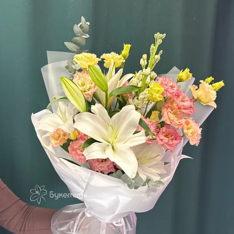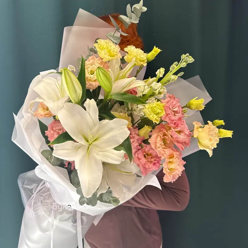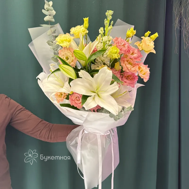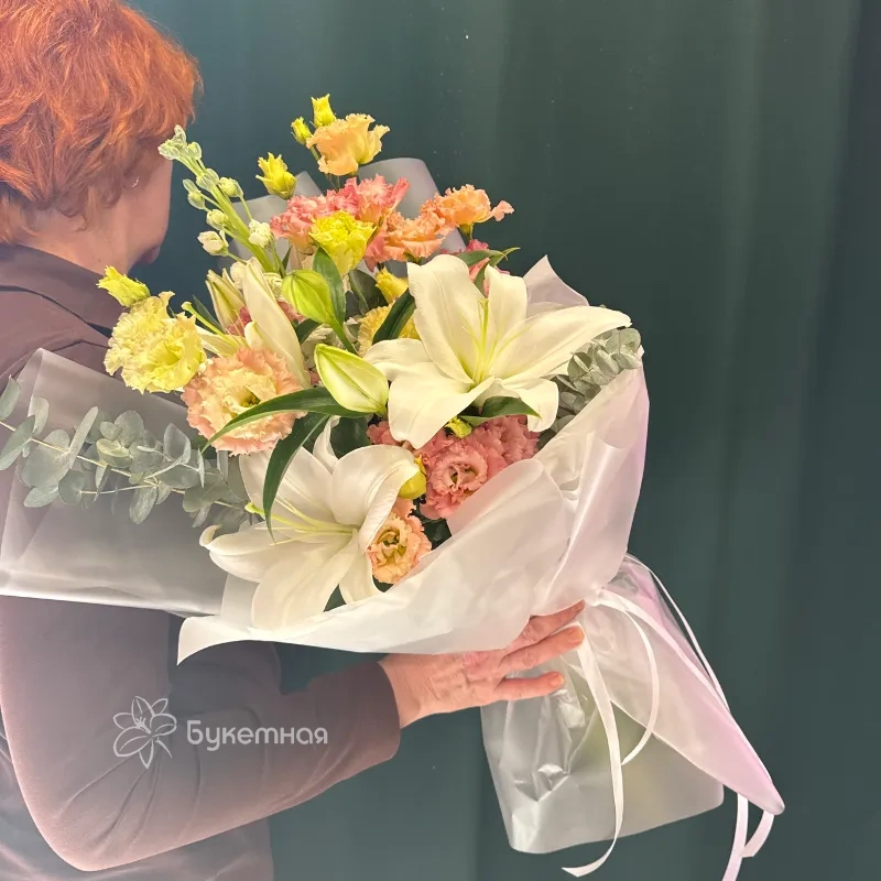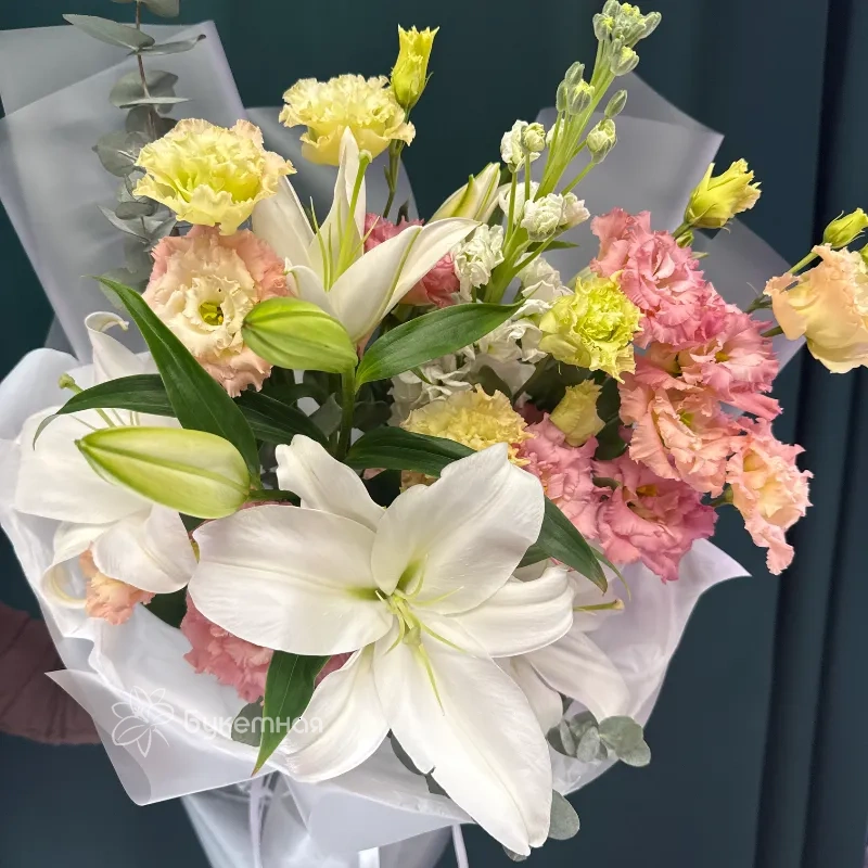 Букет «Мишель» – это воплощение нежности и утонченности, созданное для тех, кто ценит изысканность в каждой детали. Воздушный эвкалипт придает композиции природную свежесть и объем, окутывая цветы дивным ароматом. Нежные соцветия маттиолы добавляют букету романтики и легкости, словно легкое дуновение ветра. Благородная эустома своими бархатистыми лепестками подчеркивает изысканный вкус и утонченность. А величественная лилия, раскрываясь, наполнит пространство королевским шармом и благоуханием. Этот букет станет идеальным подарком, способным выразить самые искренние чувства. Каждая веточка, каждый бутон в «Мишель» пронизаны любовью и вниманием к деталям. Подарите себе или своим близким это произведение флористического искусства. «Мишель» – безупречный выбор для особенных моментов.