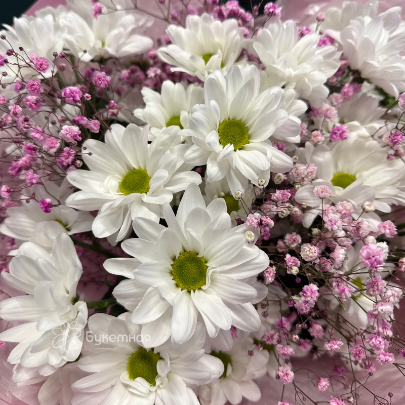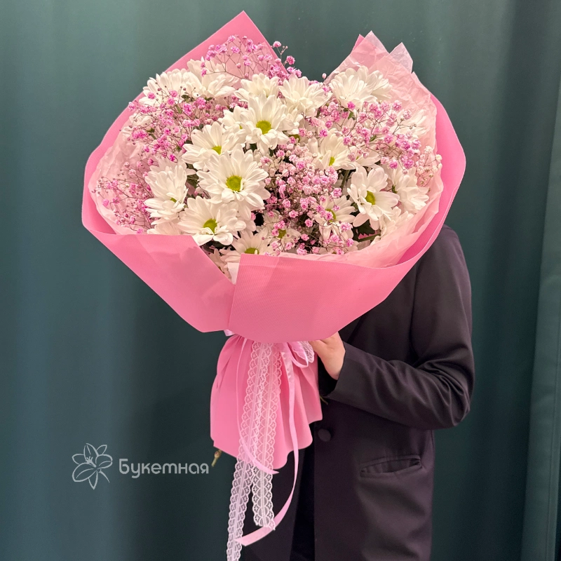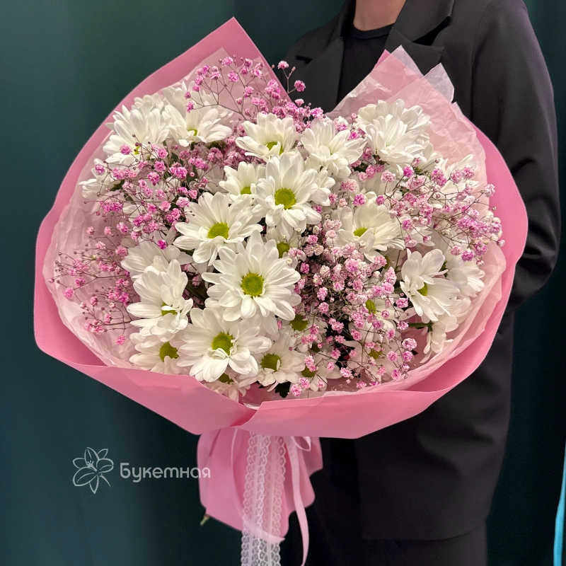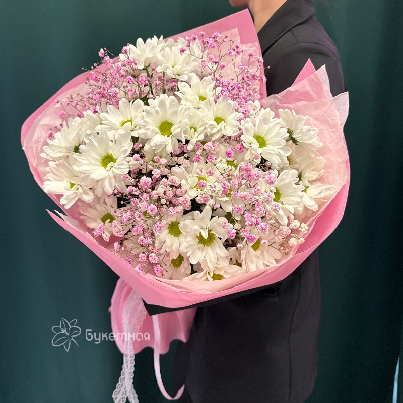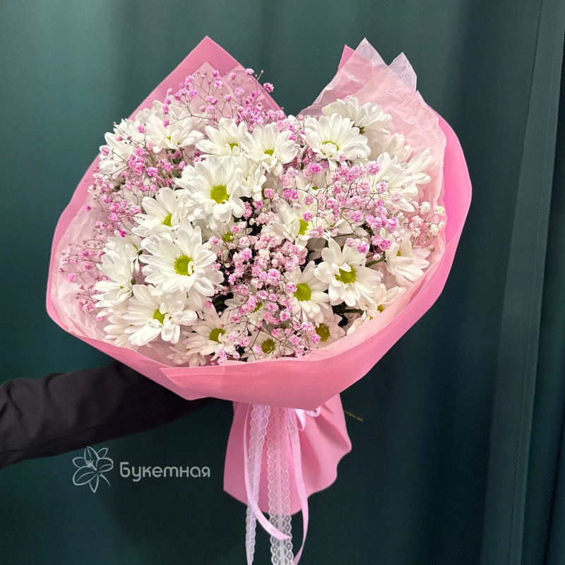 Нежный букет «Романтика» с воздушной гипсофилой и очаровательными хризантемами станет идеальным подарком для выражения самых трепетных чувств. Сочетание этих цветов создает легкий и изящный образ, полный искренности и романтики. Подарите мгновения нежности и счастья с этим прекрасным букетом.